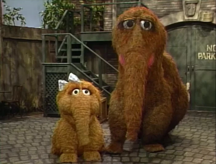 SCENE 4 cont'd | Big Bird finally reaches the Snuffleupagus residence, having counted 2,000 steps. Snuffy happens to be home and wants to join Big Bird in his cartography quest. They head back toward Sesame Street, with Snuffy trailing slightly behind Big Bird. |
