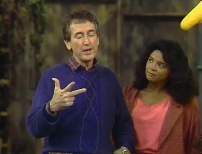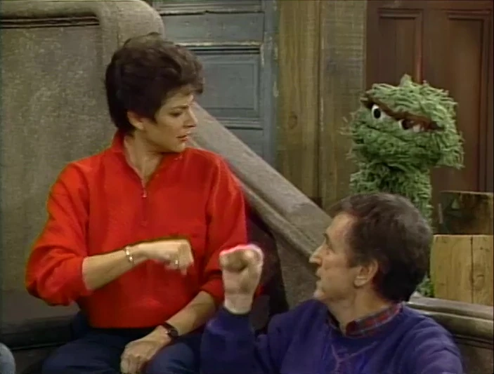 SCENE 2 | Oscar is annoyed that Bob and Linda are teaching the kids signs right by his trash can, especially positive ones. ("What is this, Ding Dong School?") The kids learn how to sign happy and sad and decide to play a game where they sign the opposing emotions, tricking Oscar into thinking they're arguing in sign language. Oscar becomes intrigued until everyone goes to Hooper's Store for a snack. Disgruntled, Oscar has an argument with himself instead. |
