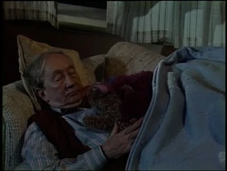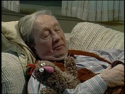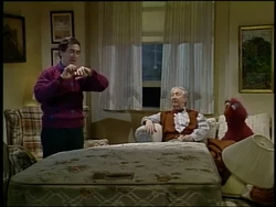 SCENE 5 | All the painting has been completed, and Bob and Uncle Wally plan to move the furniture back into the bedroom tomorrow. Bob is bushed, but Uncle Wally knows he won't be able to get a good night's sleep tonight (he hasn't in months). Telly tells him he needs to practice going to sleep and instructs him on how to do so, even providing him with Freddy. Uncle Wally falls right to sleep on Bob's couch afterwards. |