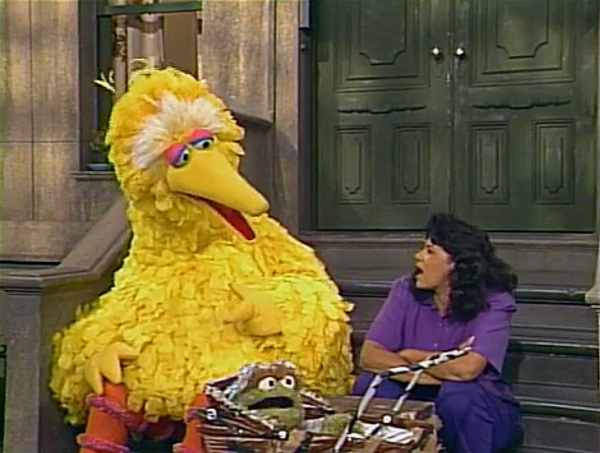 SCENE 3 | Big Bird joins Maria on the stoop, just as Maria prepares Irvine's lunch: sardines in strawberry ice cream and her milk. Big Bird explains what he's learned about opposites today and points out the opposites as Maria tries feeding Irvine. |