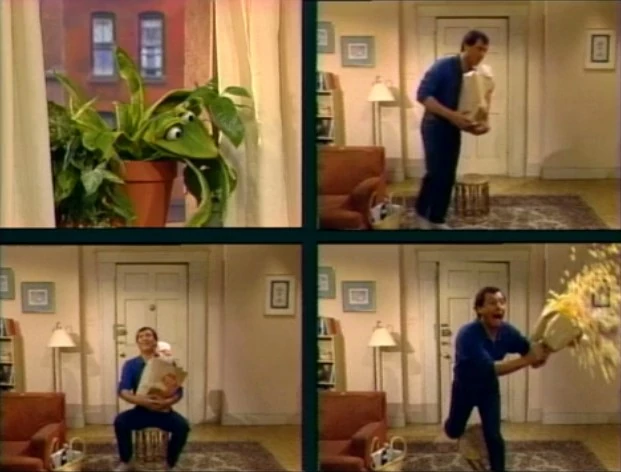 SCENE 1 | It's the crack of dawn on Sesame Street. While Maria and Luis are still asleep, on their table sits Floris McDirt, a talking plant with the air of an English gentleman. He confesses to the viewer that he's yet to speak up around Maria or Luis, suggesting he'll soon be roped into radio interviews, TV ads, and appearing on Oprah and Donahue if he does. "It simply gets out of hand," he states, before beginning to observe the habits of his owners. |