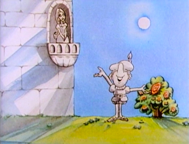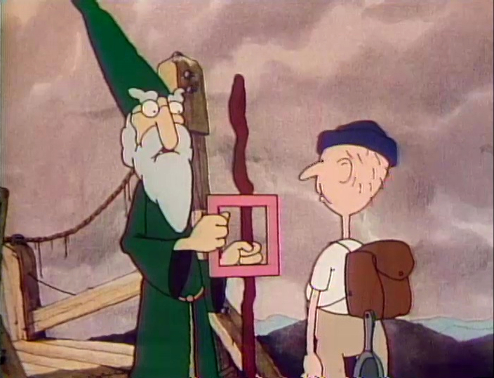 Cartoon | The Bridgekeeper stipulates that answering three questions about the square in his hand is required to cross the bridge. Question One: What is this? Question Two: How many sides does it have? Question Three: What is a square good for? A young man who wishes to cross the bridge has square-shaped building blocks in his backpack. And a girl thinks a square makes a good picture frame. Then along hops a light blue-colored monster with a red winter cap, who proceeds to eat the bridgekeeper's square, the better to satisfy his daily diet of "three square meals." (First: Episode 1618) |