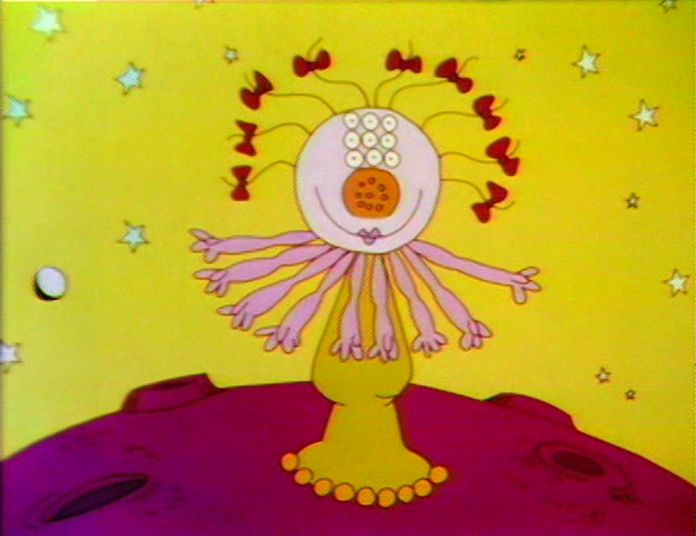 Cartoon | "Martian Beauty" has nine hairs, nine bows, nine eyes, nine nostrils, nine arms, and nine toes. Artist: Bud Luckey (First: Episode 0316) |