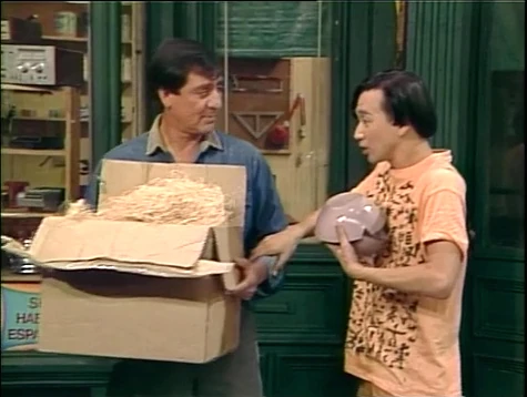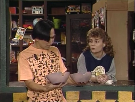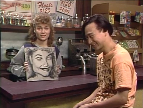 SCENE 1 | At Hooper's Store, Gina reintroduces the viewer to Hiroshi, an art student who's working on a sketch of Gina. Oscar drives the Sloppy Jalopy out of the garage and intends to keep it on the street from now on, where more damage can be done to it. Since the garage is now vacant, Hiroshi wonders if he can use it as his art studio. Oscar is reluctant to deal with someone who makes nice art, but allows him to take up residence, just as long as he pays rent - one bag of trash a week, and the first payment is due today. |