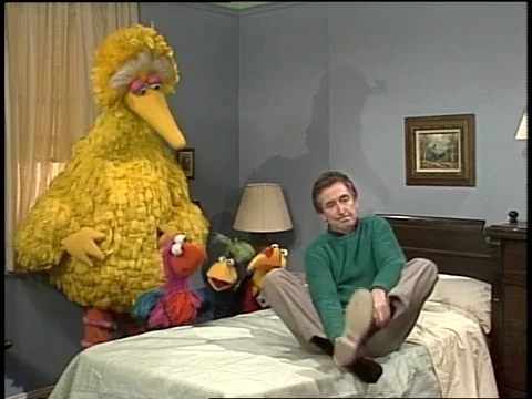 SCENE 2 | As promised, Big Bird and his tour group return to Bob's for a tour of his bedroom. He protests at first, but relents and lets them see it. The birds have a hard time understanding Big Bird's description of the bed, as they've only slept in nests before. He has Bob get into the bed and act like he's sleeping so they get the idea. The birds then hop into the bed and go to sleep themselves. |