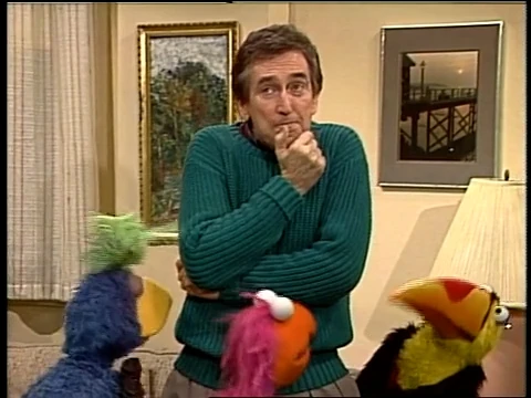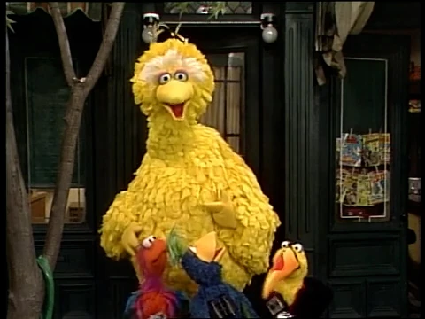 SCENE 1 | Big Bird welcomes the viewer, joined by a small group of tourist birds visiting from the country. They've never seen an apartment before, so Big Bird intends on taking them up to Bob's. Bob wants some peace and quiet to get his work done, but allows them to stay for a few minutes when he sees how disappointed they are. They noisily inspect his piano and bookcase, then Bob himself, before he asks them to leave. Big Bird leads them out, promising to return in fifteen minutes for a tour of the bedroom. |