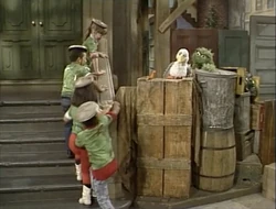 SCENE 4 | Oscar introduces the Grouchketeers to Stinky and tests their knowledge of animals sounds using all his other pets. The last sound is inaudible, that of Slimey. |