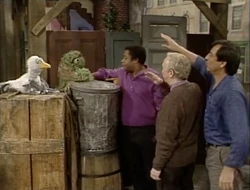 SCENE 3 | The game of chess continues, when a shoe flies from above and lands right on the board, ruining everything. The seagull retrieves it and brings it back to Oscar. He reveals to the others that he's begun to call the gull Stinky and is playing fetch with her. They try to reach a compromise, which Oscar considers cooperation, but relents anyway. Oscar throws the shoe in a different direction, then Stinky retrieves it and drops it on the chess game on her own volition. Oscar: "This is definitely the beginning of a beautiful Grouch friendship!" |