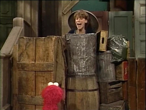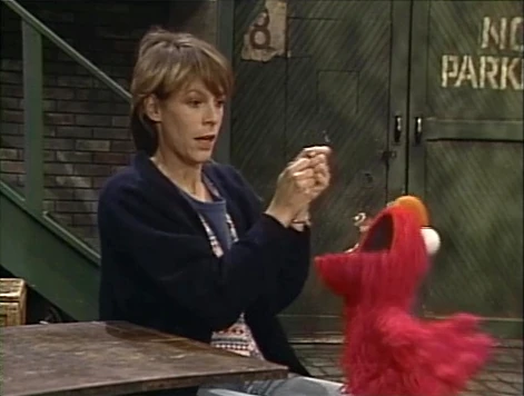 SCENE 6 | Jamie Lee finishes a piggyback ride with Elmo and says it's time to say... but, before she can finish, Elmo mopes. He assumes she's saying "Goodbye" and will miss her again. She assures Elmo that they'll still write to each other, talk on the phone, and meet up again soon. She then points out that what she was going to say was, "Tag! You're it!" The two engage in another game of tag, where at one point Jamie Lee appears in Oscar's trash can. The two share a final hug as Maria announces the sponsors. |