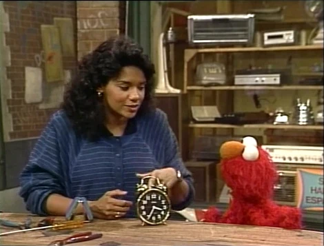 SCENE 2 | At a little over 3:30, Elmo checks the time on a clock on Maria's workbench. He runs to and from Hooper's, checking the time and hoping he won't miss Jamie Lee when she arrives. Maria has a better idea - take the clock over to Hooper's so Elmo won't have to run back and forth. Elmo eventually moves it back, finding the running to be more fun. |