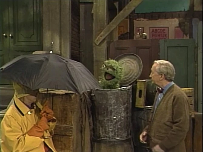SCENE 2 | Bob is about to give a letter to Oscar and asks Uncle Wally for various protective things, knowing ahead of time Oscar is going to trick him somehow and get him wet or muddy. When they arrive at his trash can, Bob is ready to get hit with something, but Oscar simply takes the letter and leaves. Bob gets upset, having gone through the trouble and asks Oscar to get him wet. Oscar refuses and goes into his can again. Furious and upset with his treatment, Bob begins taking the stuff off; Oscar chooses now to change his mind and have Fluffy squirt him. |