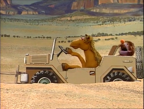 Muppets | Forgetful Jones needs something to ride around the ranch. Clementine gives him clues: it has four legs, a bushy tail, eats hay, and neighs. It's his horse Buster, who arrives with the jeep. (First: Episode 2081) |