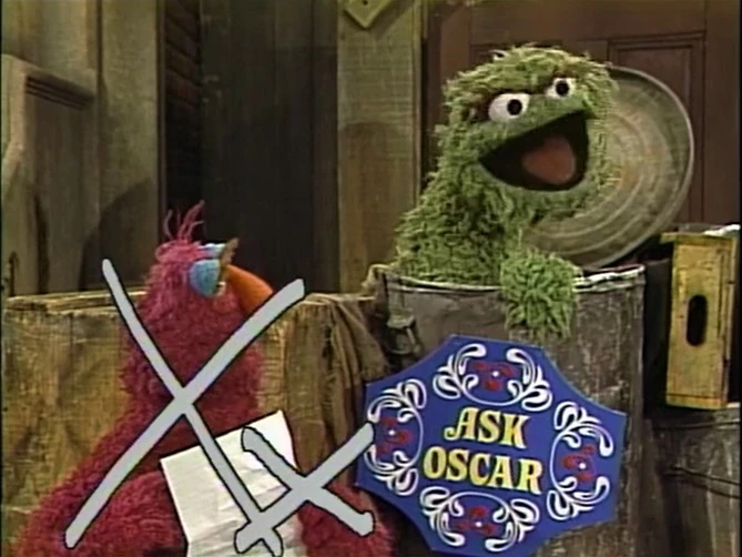 SCENE 4 | In another edition of "Ask Oscar," Oscar is asked what the letter X is good for. Oscar shows that the letter X can be used to cross out his daily annoyances, such as bothersome neighbors, annoying letters, and annoying letter readers (referring to Telly), drawing an X on the screen each time they are shown. The show ends with the entire screen filled with X markings. |