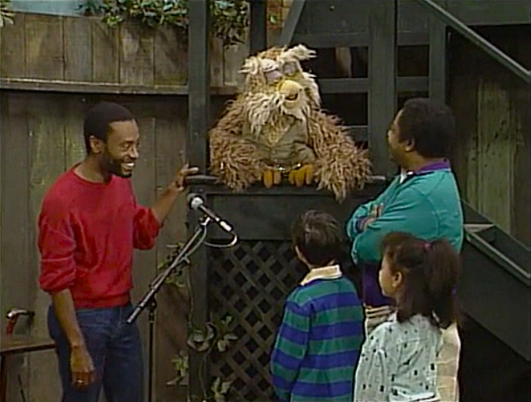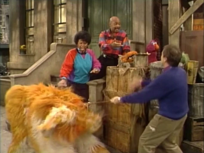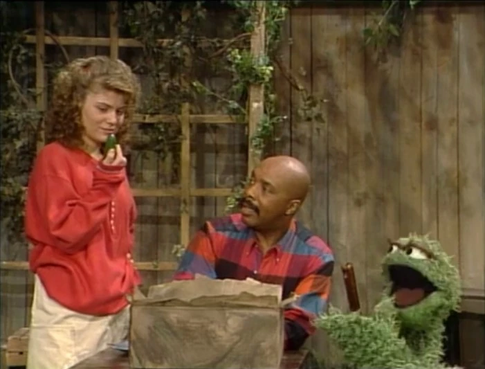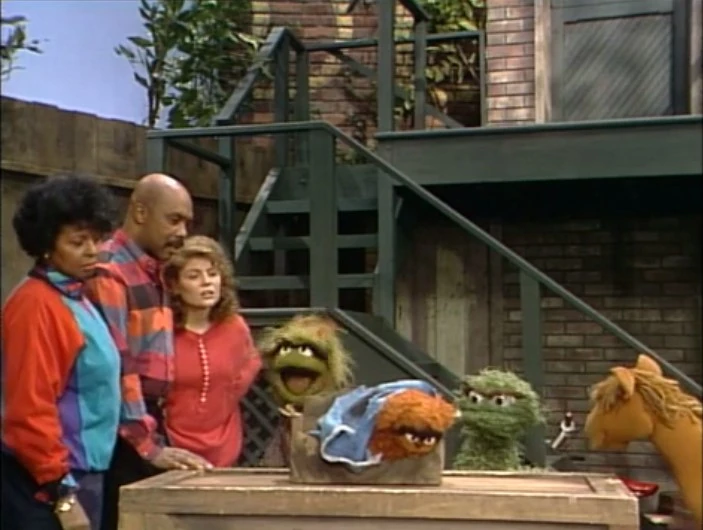 SCENE 6 | Susan wonders what makes Preposterous a Grouch dog if he doesn't seem to be doing much, so Oscar tells her to wait and see. Telly runs in to help brush the dog and when he doesn't see him anywhere (not noticing he's under his blanket), he assumes the dog is lost and runs off to find him. Oscar then encourages Gordon to try playing fetch with the rubber pickle, only Preposterous stays put; Gordon has to do the fetching. Barkley pulls Bob into the scene, trying to get acquainted with Preposterous, who wants nothing to do with him. Amid all the commotion, Susan understands what makes Preposterous a Grouch dog. Grundgetta announces the sponsors. |