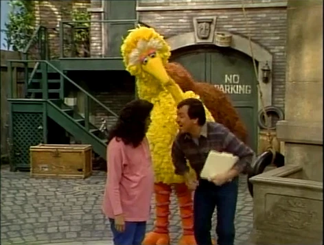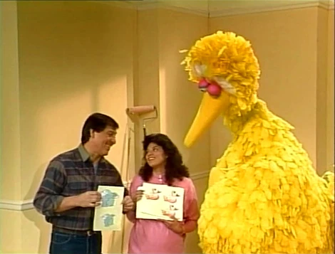 SCENE 2 | Big Bird follows the couple up to the baby's room, where the two are arguing over whether to decorate the room with cut-outs of bunnies or duckies. Big Bird comes up with an easy solution - use both! He assumes the silliness of the day is over, when Luis runs out to "meet a horse" at the Fix-It Shop. |