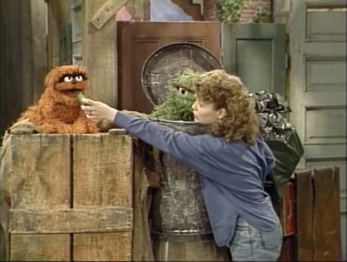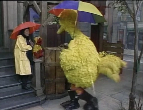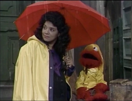 SCENE 1 | Maria welcomes the viewer on a rainy day. Elmo points out to her all the different types of sounds, like the rain hitting the pavement, Oscar's trash can lid, and Maria's umbrella. His favorite sound, however, is the sound of Big Bird walking through the puddles in his giant galoshes. |