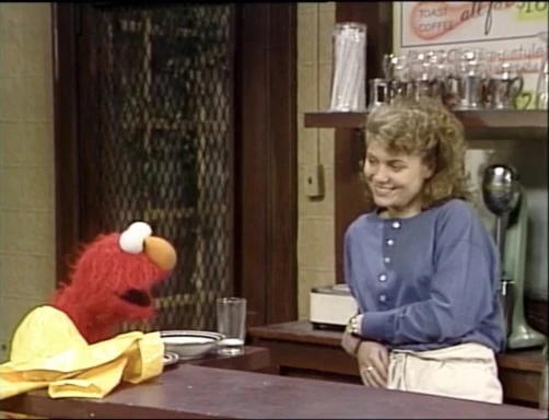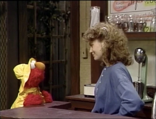 SCENE 2 | Elmo makes his way to Hooper's Store for lunch. He decides to wait outside at the table while Gina prepares his order, but she makes him come back inside and think about what would happen to his food if it went in the rain. Elmo thinks he can hold an umbrella while he eats, but realizes that he can't do both simultaneously very well. Instead, he runs off to get someone to hold an umbrella over him while he eats. |