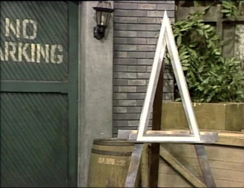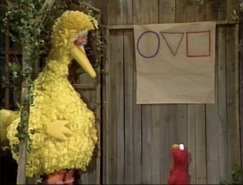 SCENE 6 | Elmo wishes to show the viewer a picture of some shapes he made, but Big Bird hung it too high on the fence for him. He tries leaping and pointing, then using a broom handle, but neither method is effective. Big Bird returns and moves it much lower, only now it's backwards. |
