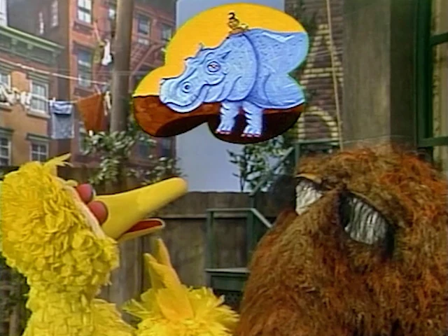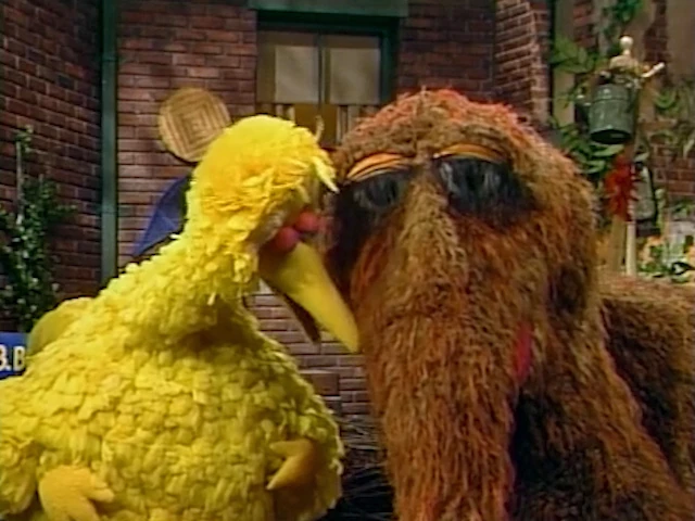 SCENE 3 | Big Bird and Snuffy come up with several potential gifts which would be useful for a baby, but they learn everyone else has already gotten them: Susan got a onesie, Gordon got some rattles, Gina got a diaper bag, Bob got a Hello Kitty music box, and Linda got a teddy bear. They put their heads together once more (CLUNK)... |