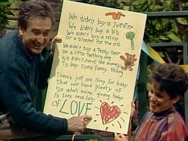 SCENE 4 | Maria continues opening her presents at the party. Big Bird and Snuffy's is a large posterboard with a poem written on it which everyone reads aloud; the poem says that their gift is plenty of love for the baby (as well as the poem itself). |