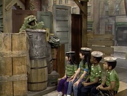SCENE 2 | Oscar teaches the Grouchketeers the "Heimyuck maneuver," meaning whenever they see a Grouch acting nice, they yell, "Yuck! Yuck-yuck-yuck!" until the Grouch is back to normal. He gives them a couple of scenarios so they can practice. |