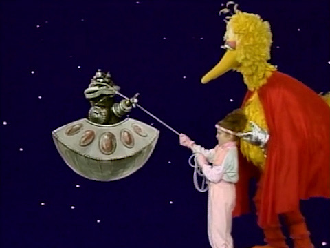 SCENE 2 | Big Bird and Anna imagine the rope is now a "Laser Lasso." They imagine themselves out in space, as Anna (as "Luke Cloudwalker") and Big Bird (as "Big-2 Bird-2") catch the nefarious Garth Raider (who turns out to be just a fire hydrant in real life). |