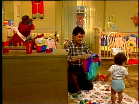 SCENE 3 | Big Bird and Snuffy need Maria to help with their rhyming game, where they match objects with rhyming words. They have a rock and sock, a plate and skate, and finally an Anything Muppet (David Rudman) who's laughing hysterically, for which they couldn't find a rhyme... that is, until Maria showed up with Gabriela (rhyming with the "happy fella"). |