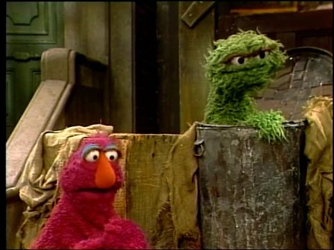 SCENE 5 | Telly wants to play a game with Oscar, who wants nothing to do with it. He then gets an idea and proposes they play a "Near and Far" game, where he stays near his trash can and Telly goes far away. Oscar thinks he's rid himself of Telly, who rushes back and announces it's time to switch. |