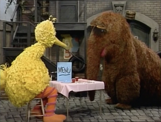 SCENE 1 | Today for Big Bird and Snuffy’s playdate, they’re playing "restaurant." They sit down and wait for the waiter to serve them... until they realize no one is playing the waiter. Big Bird assumes the role and brings Snuffy a bowl of cabbage soup. He finds it too hot and tries to cool it down by blowing on it with his snuffle, blowing away the table and everything on it. |