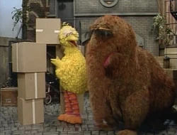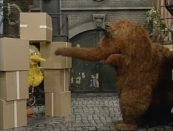 SCENE 2 | Big Bird convinces a hesitant Snuffy to join in on another game: a reenactment of "The Three Little Pigs." Big Bird has made a cardboard box house for himself to be in as a pig. Snuffy plays the wolf, and blows the house down. Big Bird compliments Snuffy on his talent, adding, "There's a game for everyone, see, and you make one heck of a great wolf!" |