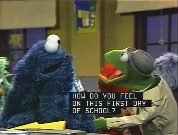 Muppets | Sesame Street News Flash: First Day of Monster School — Cookie Monster is afraid of kindergarten. (First: Episode 1628) The segment starts on the TV in SCENE 4, and is shown with closed captioning. |