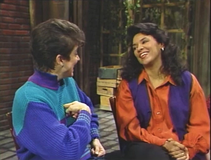 SCENE 5 | Snuffy has joined the group as Linda and Maria watch Edge of Tomorrow. Snuffy finds the idea of a soap opera comical: "Soap can't sing!" Maria shushes them as they finish watching today's thrilling episode, where Crystal (played onscreen by Fran Brill) reveals she has been discussing business with Doctor Bob, threatening her relationship with Kimberly (LaTanya Richardson Jackson). At the episode's conclusion, Linda and Maria discuss what they've witnessed, and Linda is happy to be able to watch TV with her best friend. Snuffy decides he'll let Linda borrow his TV for the rest of the day... even if it means missing Mister Rogers. He and Big Bird then begin a rousing discussion on their favorite parts of that show. |