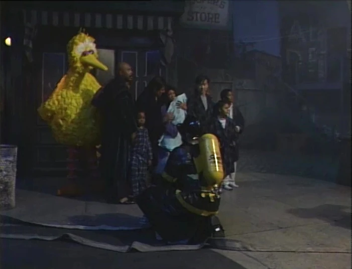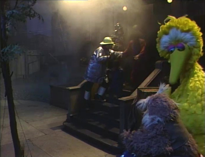 Hiroshi shows up and joins a panicked Big Bird and Hoots as the fireman help evacuate the residents of the building (save for Ernie and Bert, who are on vacation, as seen earlier). As the firemen dash in with an axe and the hose to combat whatever fire there is inside, a worried Susan wonders what will happen to their apartment. |