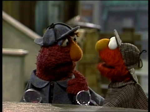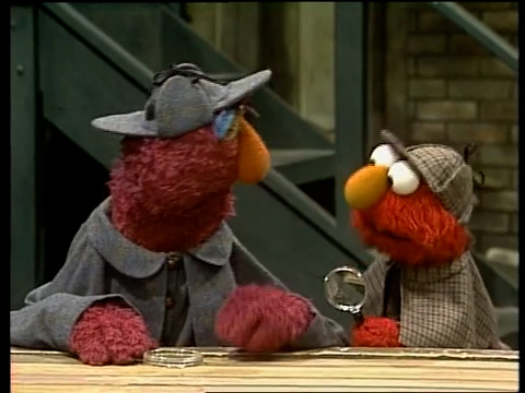 SCENE 1 | Telly and Elmo pretend to be detectives: they're dressed in Sherlock Holmes-esque outfits, holding magnifying glasses, and even have some mysterious music backing them up. Telly wants to quit, though, as there aren't any mysteries on Sesame Street to solve. Elmo tries to make mysteries out of some nearby sounds, but Telly is quick to point out the sources. They don't hear anything after that and wonder why... which makes it a mystery! |
