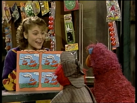 SCENE 4 | Telly returns to Hooper's with a board with four drawings - three have two steamboats and one has a single boat, leading to a round of "One of These Things." Elmo gets the right answer and believes the game was very similar to a mystery. Telly says it was a different kind of mystery - with a song. |