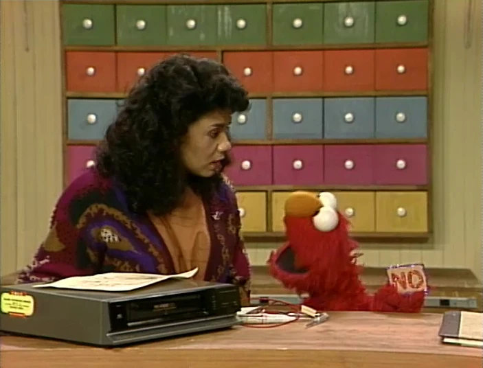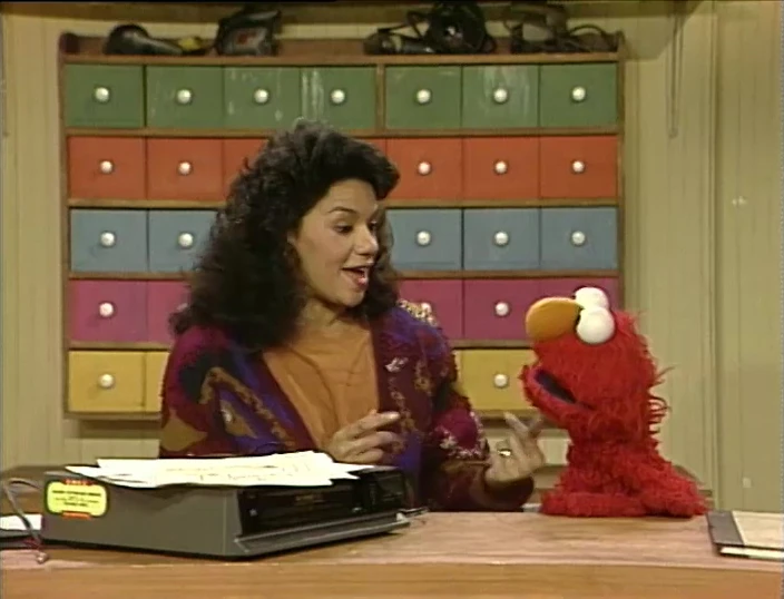SCENE 2 | Elmo now wants to help out Maria at the Fix-It Shop, but she is preoccupied with a broken VCR. She sees how sad Elmo has become and suggests he help himself by practicing the alphabet and counting to 10 in Spanish (with a little help from herself). |
