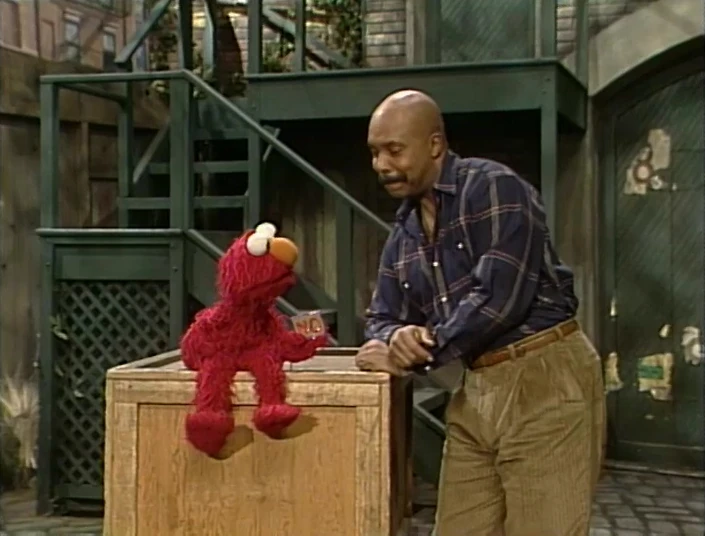 SCENE 4 | Elmo comes back to Biff, who holds a drawer steady while the glue dries. Elmo answers all his questions with "NO," irritating Biff and forcing him to scratch his itchy nose on the wood. Elmo finds this funny and goes to see if something similar will happen with Maria. |