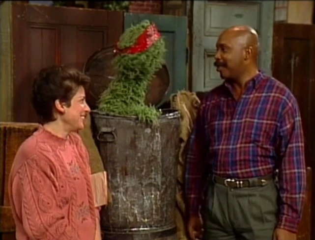 SCENE 1 | Linda tries to get Oscar's attention, but he refuses to come out from his can believing she's got something nice to say. Gordon relays her messages by yelling into the can, when Oscar finally emerges wearing a blindfold so he can't see Linda's signs. Her news regards famous writer of Grouch poetry Henry Wadsworth Wrongfellow, who will be doing a special reading at the library today in a few hours. Upon hearing this, Oscar springs from the can and rushes over to get a good seat. |
