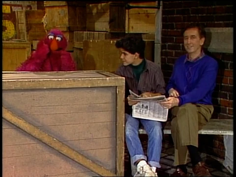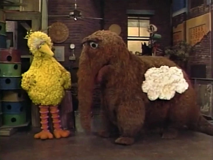 Muppets | Snuffy shows Big Bird the cloud costume he's going to wear in his Snufflegarden class's upcoming pageant about the sky, and even sings the song that accompanies it, while Big Bird imagines him as a cloud. (First: Episode 2082) |