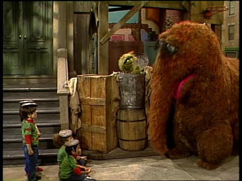 SCENE 2 | Grundgetta and the Grouchketeers wearily show Mr. Snuffleupagus that no matter how they're arranged, there will always be four Grouchketeers. |
