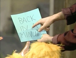 SCENE 6 | Dan remembers how Gina and the "floppy-haired girl" taught him to read, and he succeeds in reading the sign: "Back in a minute." Big Bird comes back, and he and Gina are impressed with Dan's progress. Elmo announces the sponsors and congratulates Dan. |