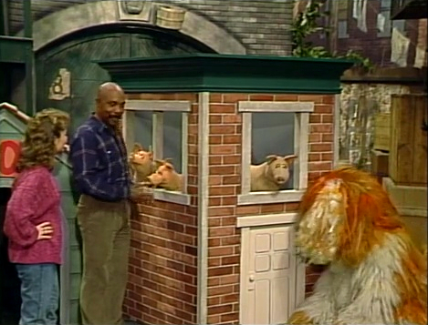 SCENE 4 | Gordon tells Gina about the pig he saw earlier, when he returns, carrying a large stack of bricks. Two more pigs come by with some sticks and more bricks. Gordon and Gina realize that those must be the Three Little Pigs and see the new brick house they've built. Gordon remembers the cow that was around earlier as well, as the cow passes through wheeling a load of lumber behind him. |