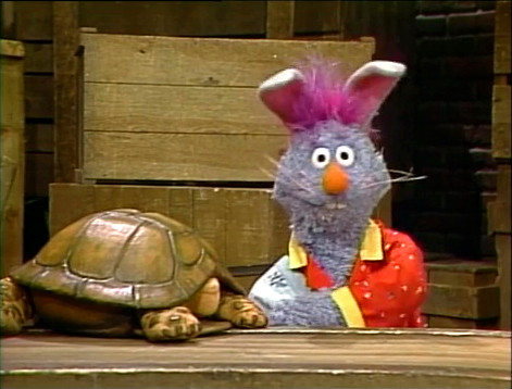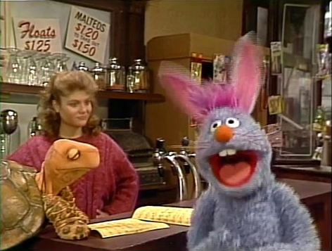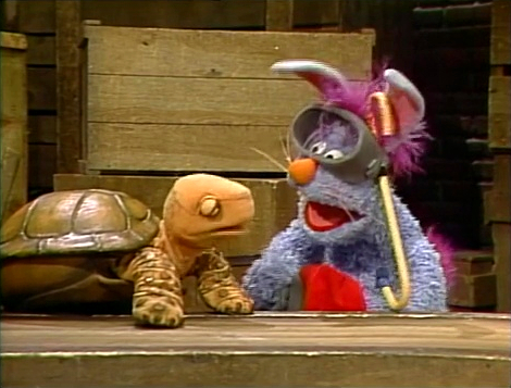 SCENE 1 | Shelley the Turtle talks to his friend, Rudder Rabbit, on the Hooper's Store payphone. He tells Gina that Rudder will be arriving from 3rd Street any moment. Gina points out how far away the street is and it'd be impossible for him to get to Hooper's so quickly. Sure enough, Rudder bursts through the door a few seconds later. Despite their different speeds, they both are good friends and sing a song about slow and fast. |