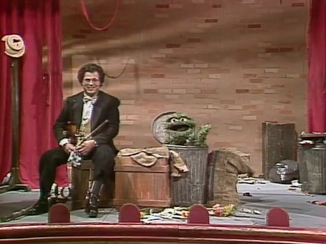 Muppets / Celebrity | Bob and Maria take their seats at Grouch Symphony Hall, sitting amongst an audience of grouches. They're there to see Oscar the Grouch who will be sharing the stage with Itzhak Perlman; Maria: "not the Itzhak Perlman?!" They'll be playing Johann Sebastian Blech's "Double Sonata for Violin, Vacuum Cleaner, Policeman's Whistle, Fire Engine Siren, Jackhammer, Automobile Horn, Elephant Jumping into Swimming Pool, and Nose." Maria thinks it's got to be a mistake.