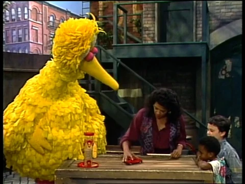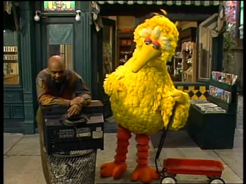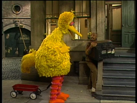 SCENE 1 | Gordon needs to move his broken - and heavy - TV set over to the Fix-It Shop. Big Bird pulls a wagon down the street, pretending it's a taxi. He gives Gordon several suggestions on how he can move the TV (like using a crane or getting Snuffy's help), though none of them will do. Gordon suggests putting the TV into the "taxi" and driving it to the Fix-It Shop, but Big Bird claims to be "off duty." He relents it was just a joke and offers to help. |