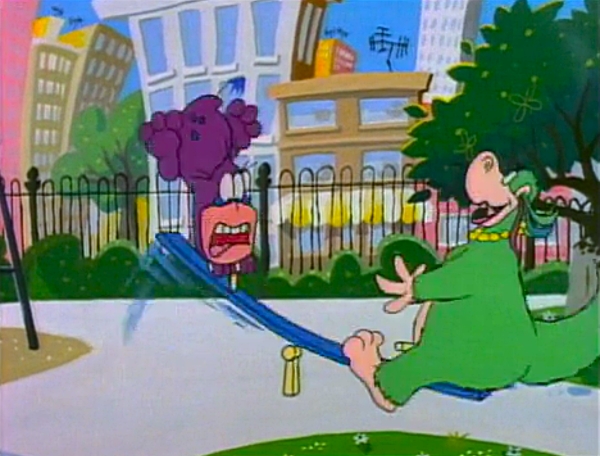 Cartoon | Flossee and Splatt stop at the playground and play rather intensely on the seesaw. |