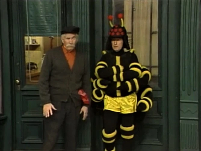 SCENE 5 | Telly conducts his experiment: Bob crawls around the ground and Telly tries to count how many legs a spider has. Telly has a hard time doing so, so he hands Bob a handkerchief so he knows what leg he started with. After Telly finishes, Bob discovers he's locked out of his apartment, and some passing friends give him strange looks. This scene is trimmed to remove David and Gina's on-screen appearances. |