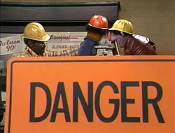 SCENE 4 | Biff and the crew get in place to hang the dollar, setting up a "DANGER" sign to warn everyone of potential mishaps. Biff makes Mr. Handford and Gina wear hardhats "just in case" as he prepares to hammer the nail. Suddenly, the lunch whistle blares and the hardhats stop for their break. Biff gleefully assumes lunch is on the house while the cash register remains broken. |