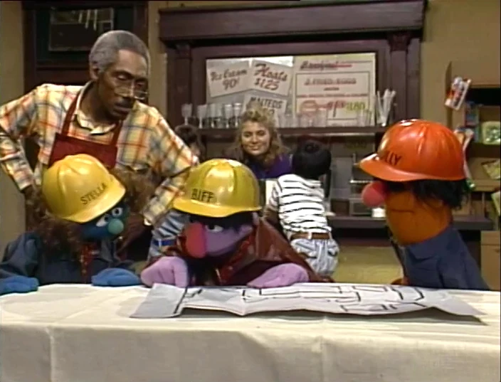 SCENE 3 | Biff and Sully are back and have hired an extra worker to help with the job - Stella, who only says "Yo!" The hardhats study the building blueprints for the store and make sure the plans and store match - "You wouldn't want us to hang the dollar in the wrong store, would ya?" Biff justifies. The trio then struggles to fold the plans back up (Biff suggests calling the teamsters for help) as Mr. Handford wonders aloud if he should just do the job himself. |