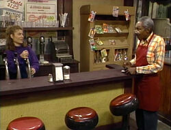 SCENE 1 | Mr. Handford notes some of the wear-and-tear Hooper's Store is experiencing lately - the awning gets stuck as he cranks it and Big Bird is unable to get through the stuck door, accidentally removing the doorknob. Gina lets them inside, where Mr. Handford sees one of the stools is now coming loose (thanks to Alice trying to sit on it yesterday). He creates a list of things Maria and Luis need to fix, then muses about having a totally new store. Maria and Luis stop by, having framed Mr. Handford's first dollar from the store. They can't stay to hang it up; they're going downtown to buy some wood. |